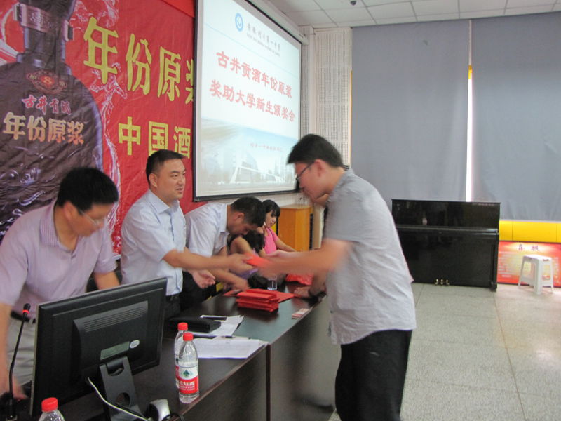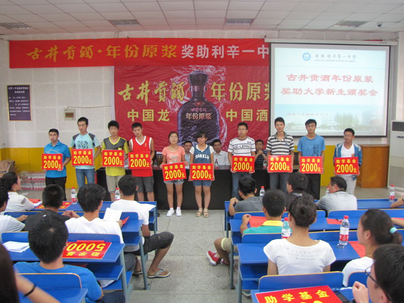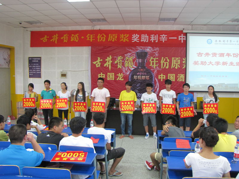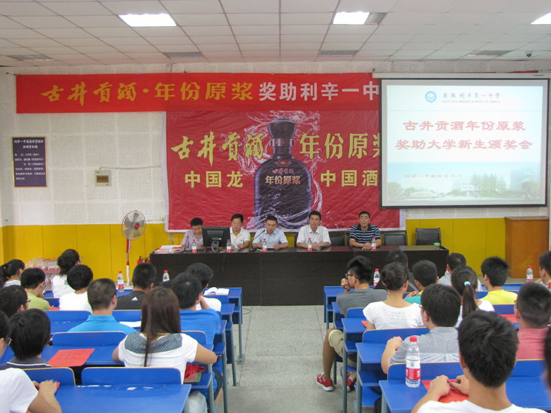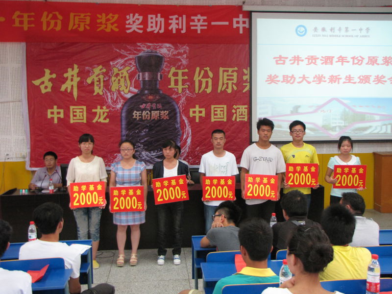 2013年8月20日上午,古井贡酒-年份原浆奖助利辛一中颁奖会在我校阶梯教室举行。王学哲校长、吴峰副校长、任锋副校长、校长助理代树峰、古井集团利辛大区经理吴禄太及工作人员、我校部分今年考取大学的优秀毕业生出席了会议。