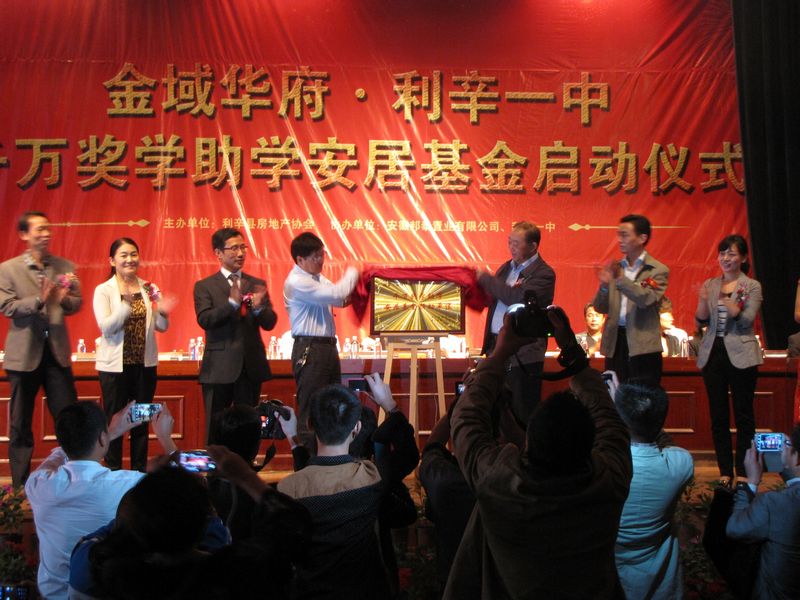 启动仪式上,沙林森副会长、芮绍勇副县长、潘化鹏书记、陈齐董事长和学生代表发表了热情洋溢的讲话,邦泰公司与利辛一中签署了《战略合作协议》,陈齐董事长把68万元奖学助学基金交给利辛一中代表潘化鹏书记,沙林森副会长和芮绍勇副县长为“金域华府·利辛一中千万奖学助学安居基金”揭牌。