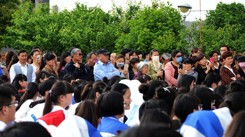 围观者在通道两侧站成密不透风的人墙,无法拍摄到入场中的学子。