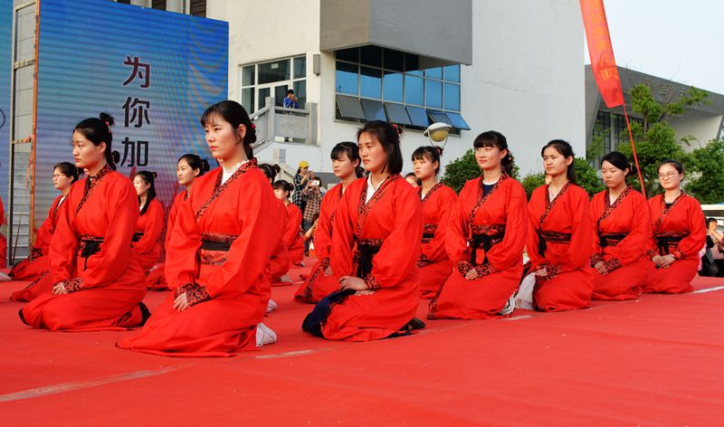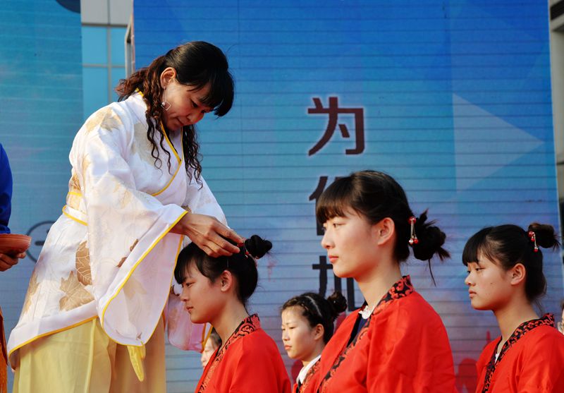 整个仪式分三个部分。第一部分:王学哲校长致辞,家长和孩子互赠书信和礼物,班主任和学生深情互动,集体宣读励志口号。第二部分:高一高二学弟学妹为高三学哥学姐表演精彩的文艺节目。第三部分:行冠礼和笄礼,宣读成人誓词,放飞象征梦想的彩色气球。