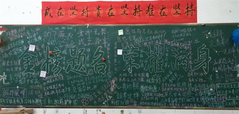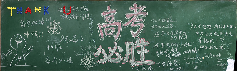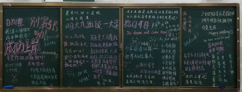 亲爱的高三学长学姐们,今天我们拿起粉笔,写下对你们的祝福;我们精心布置教室,祈祷能够再多带给你们一些好运。十年辛苦不寻常,一朝绽放满芬芳。愿你们平心静气,去迎接即将到来的征程;愿你们轻装前行,昂首走向山高海阔的无限美好的明天!