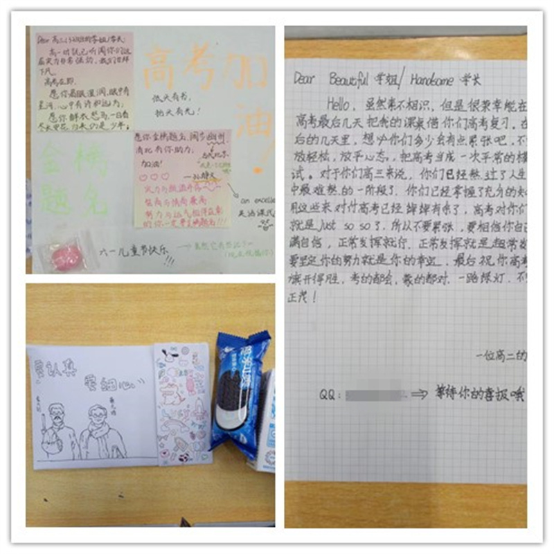 又是一年高考时,高一高二的学子们用自己的方式为高三的学长学姐们送上了诚挚的祝福。