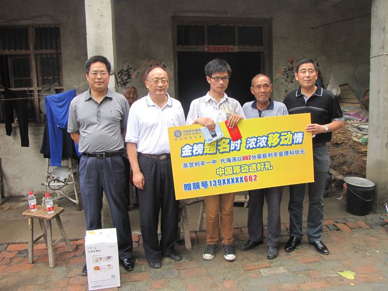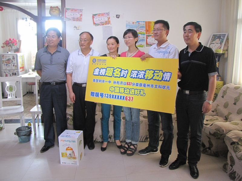 2012年6月29日上午,县教育局党组副书记、总督学李品华,利辛一中党委委员、副校长任锋,利辛移动公司副总经理王文明一行专程前往我校学生亳州市文科状元孙彤玥和利辛县理科状元代海涛家中,对两位同学在高考中取得优异成绩表示祝贺。利辛移动公司还向两位同学赠送了贺礼,勉励两位同学进入大学继续勤奋学习,将来为家乡的建设贡献自己的力量。两位同学的家长对利辛一中对子女的辛勤培育和移动公司对子女的关爱表示由衷的感谢。