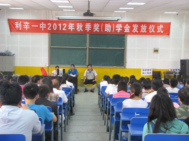 2012年8月28日上午,利辛一中2012年秋季奖(助)学金发放仪式在南阶梯教室举行,潘化鹏书记主持发放仪式,总务副主任杜颖武、主管会计解玲玲负责奖(助)学金的具体发放工作。