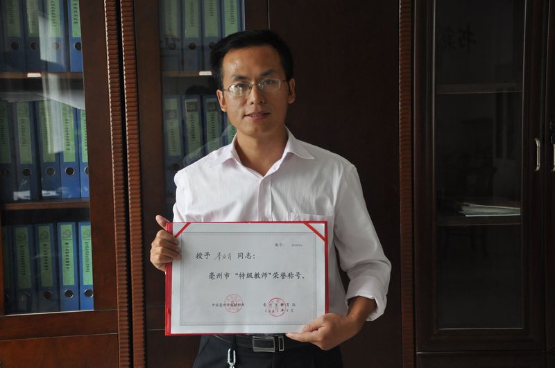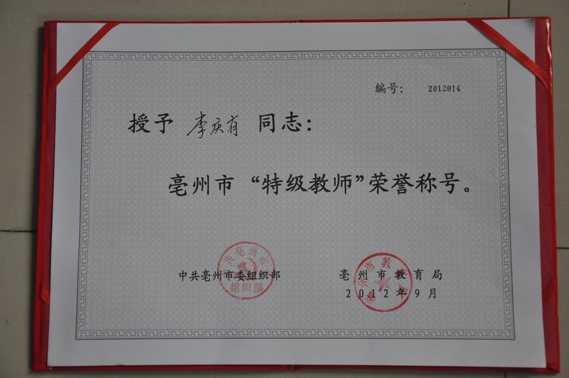 热烈祝贺我校教师李庆有获亳州市特级教师称号,高晓彬获市骨干教师称号,赵翠琴、纪灵、丁浩、倪蕾、赵旗等