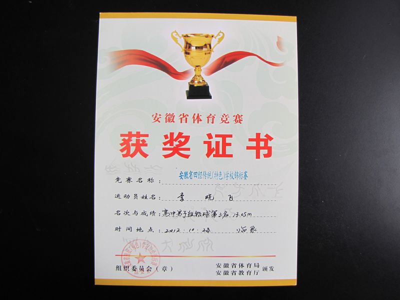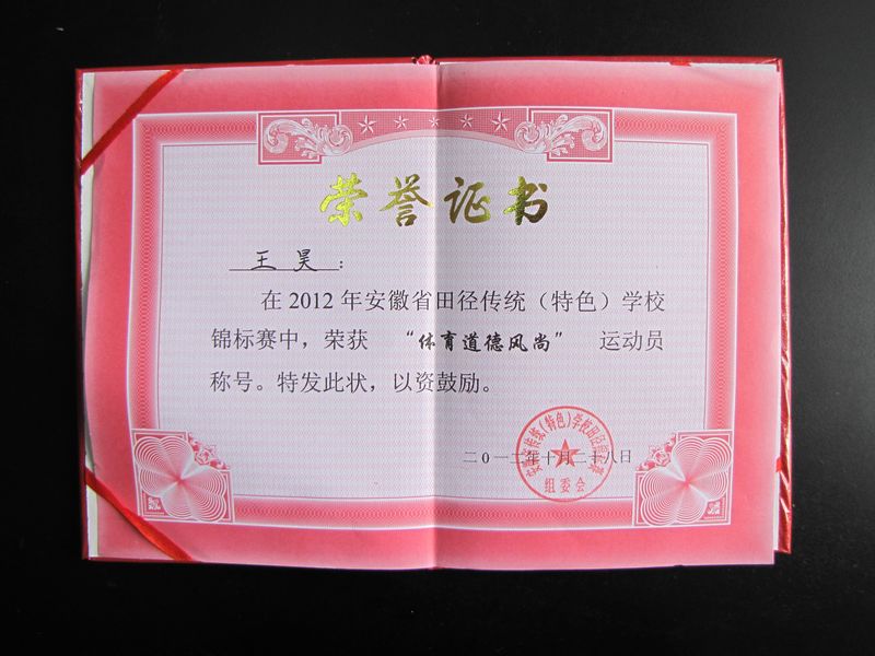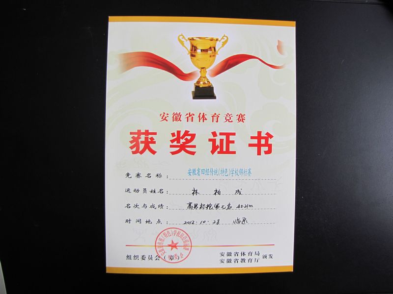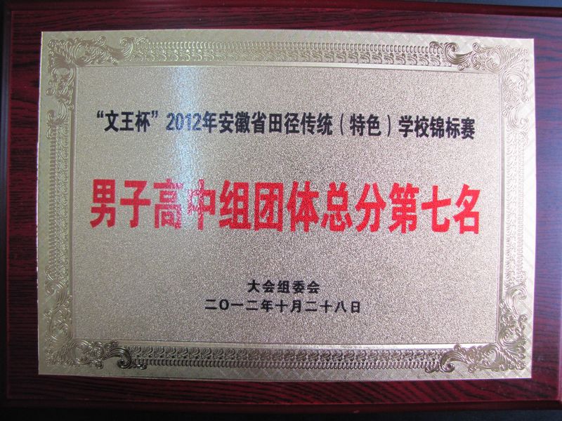 2012年10月25—28日,“文王杯”2012年安徽省田径传统(特色)学校锦标赛在安徽省最大的县级体育场——临泉县体育场隆重举行,来自全省各地市的61支代表队、约900名运动员参加小学组、初中组和高中组70个项目的比赛。我校运动健儿在齐新华、袁立志、崔智三位教师的带领下,团结进取,奋力拼搏,再创佳绩,荣获男子团体第七名。获奖选手名单如下:
