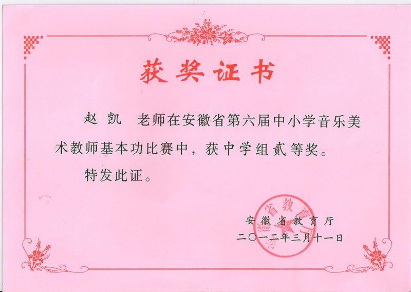 祝贺赵凯老师在安徽省第六届中小学音乐美术教师基本功比赛中获中学组贰等奖