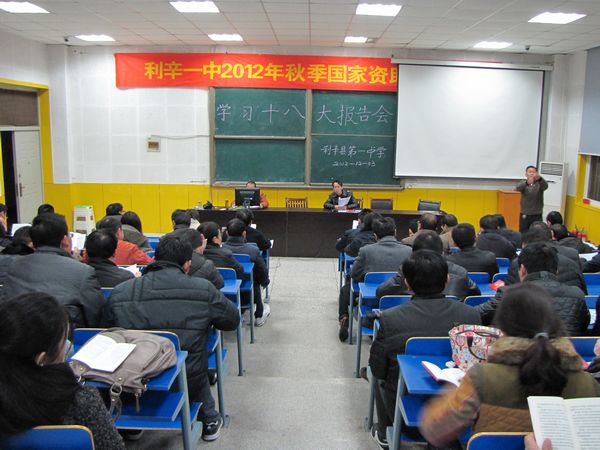 2012年12月3日下午,中共利辛一中党委在北阶梯教室召开了学习十八大报告会,校长王学哲、副校长吴峰、任锋、王晓泉、纪检书记侯云玉、校长助理代树峰以及四个支部的所有党员参加了这次报告会。
