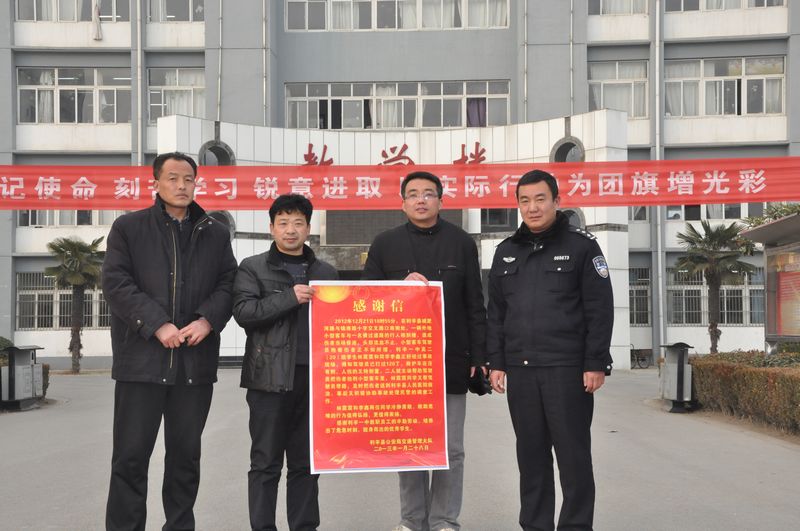 图中为:交警同志(右一)、校纪检书记侯云玉(左二)、齐新华科长(左一)、林震震和李鑫的班主任朱子云(左三)