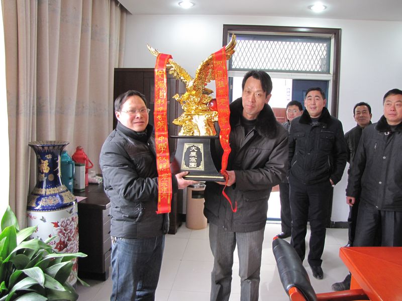 潘化鹏书记代表学校向黄桂平老师赠送纪念品(前右:潘化鹏,前左:黄桂平)