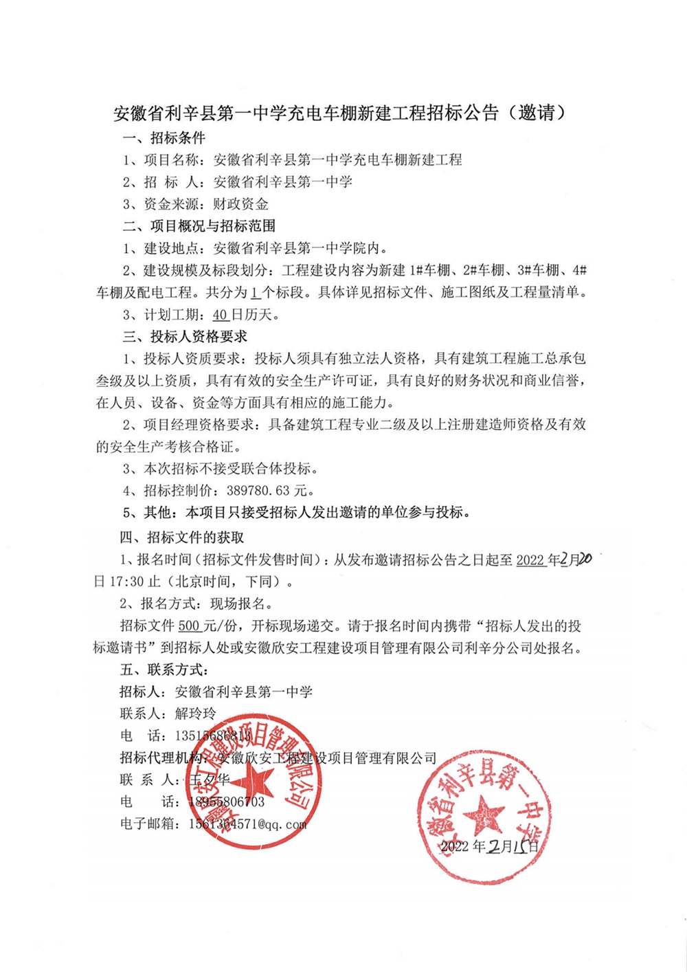 1、项目名称:安徽省利辛县第一中学充电车棚新建工程