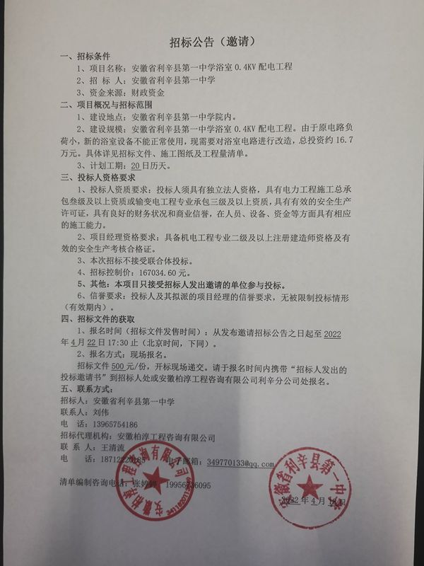 利辛一中浴室配电工程招(邀)标公告