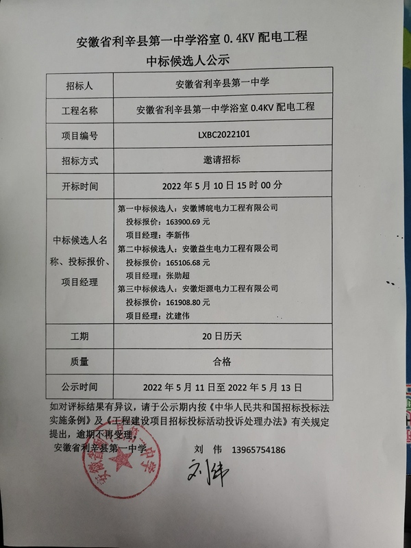 学校浴室0.4KV配电工程中标候选人公示