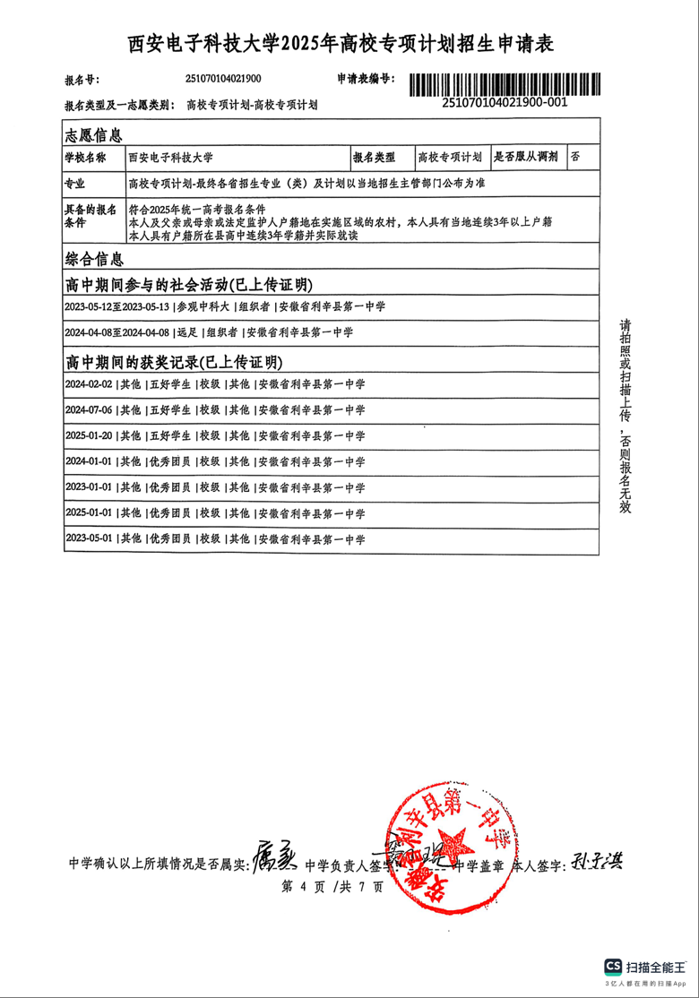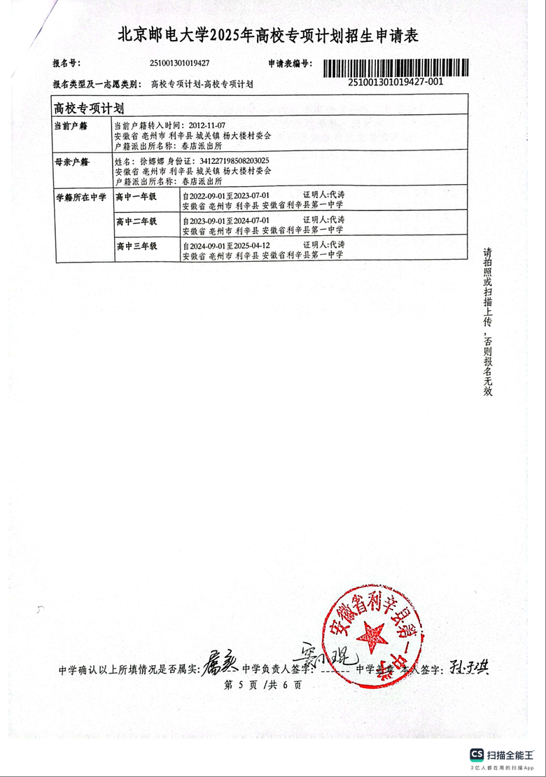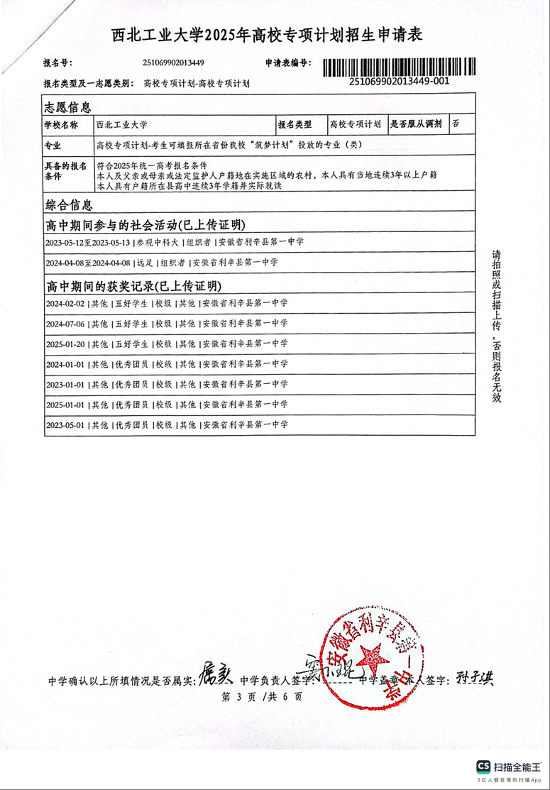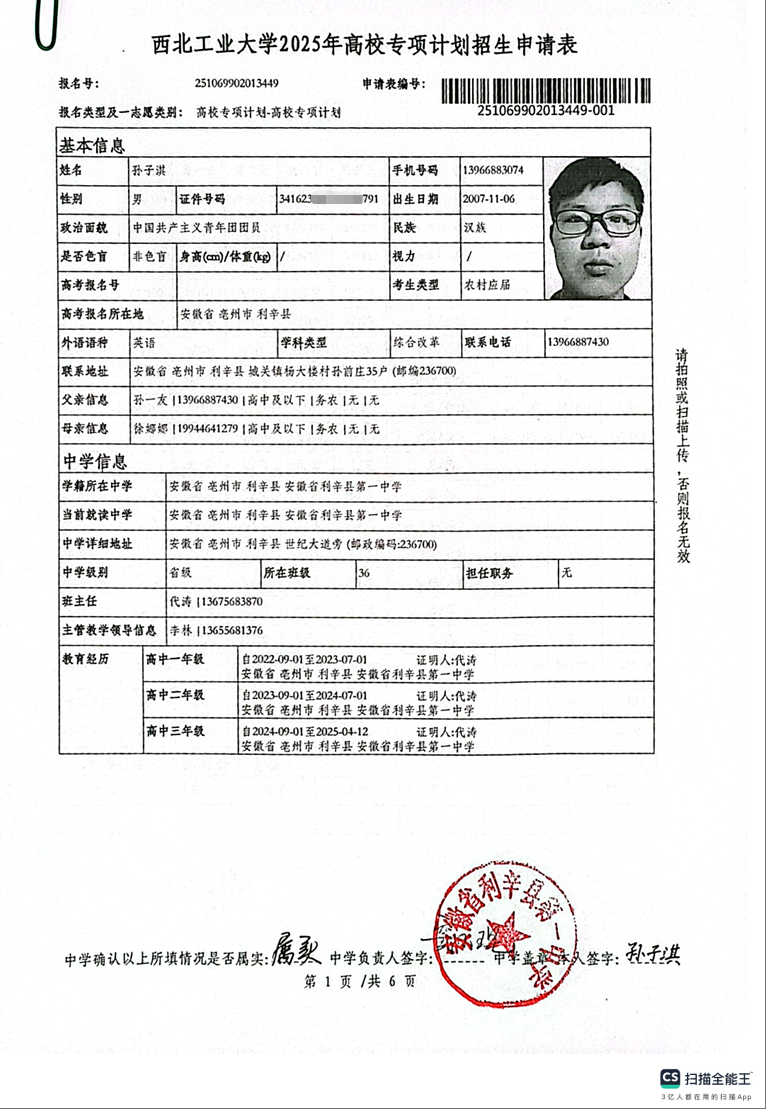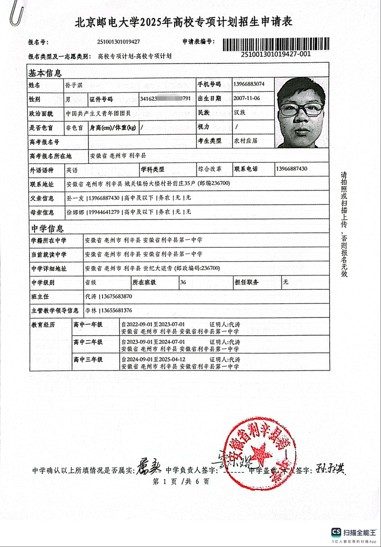利辛一中2025届报考高校专项计划学生公示——孙子淇
