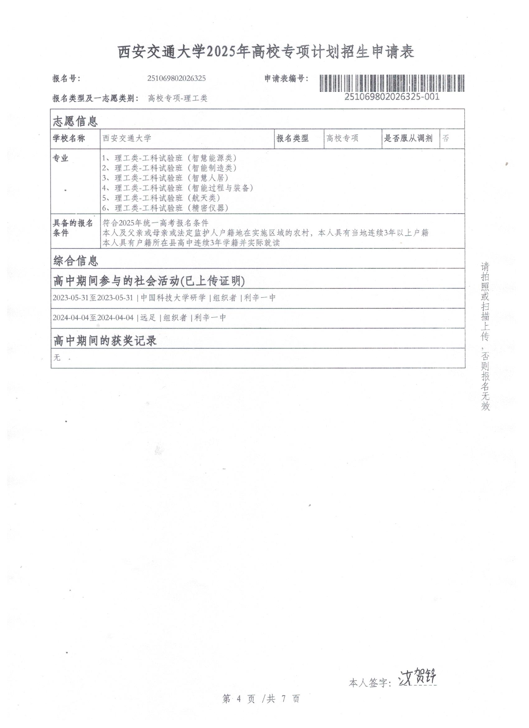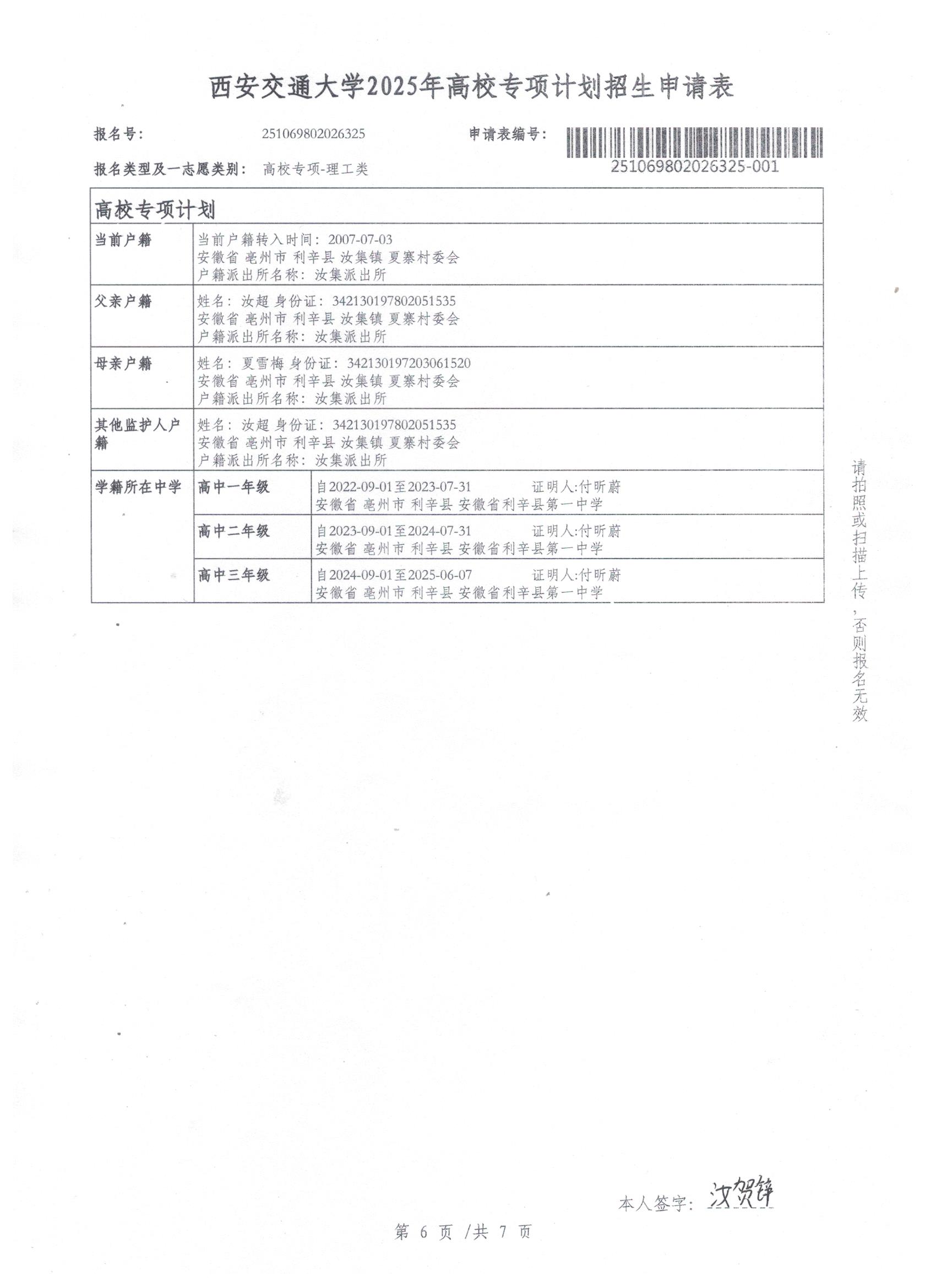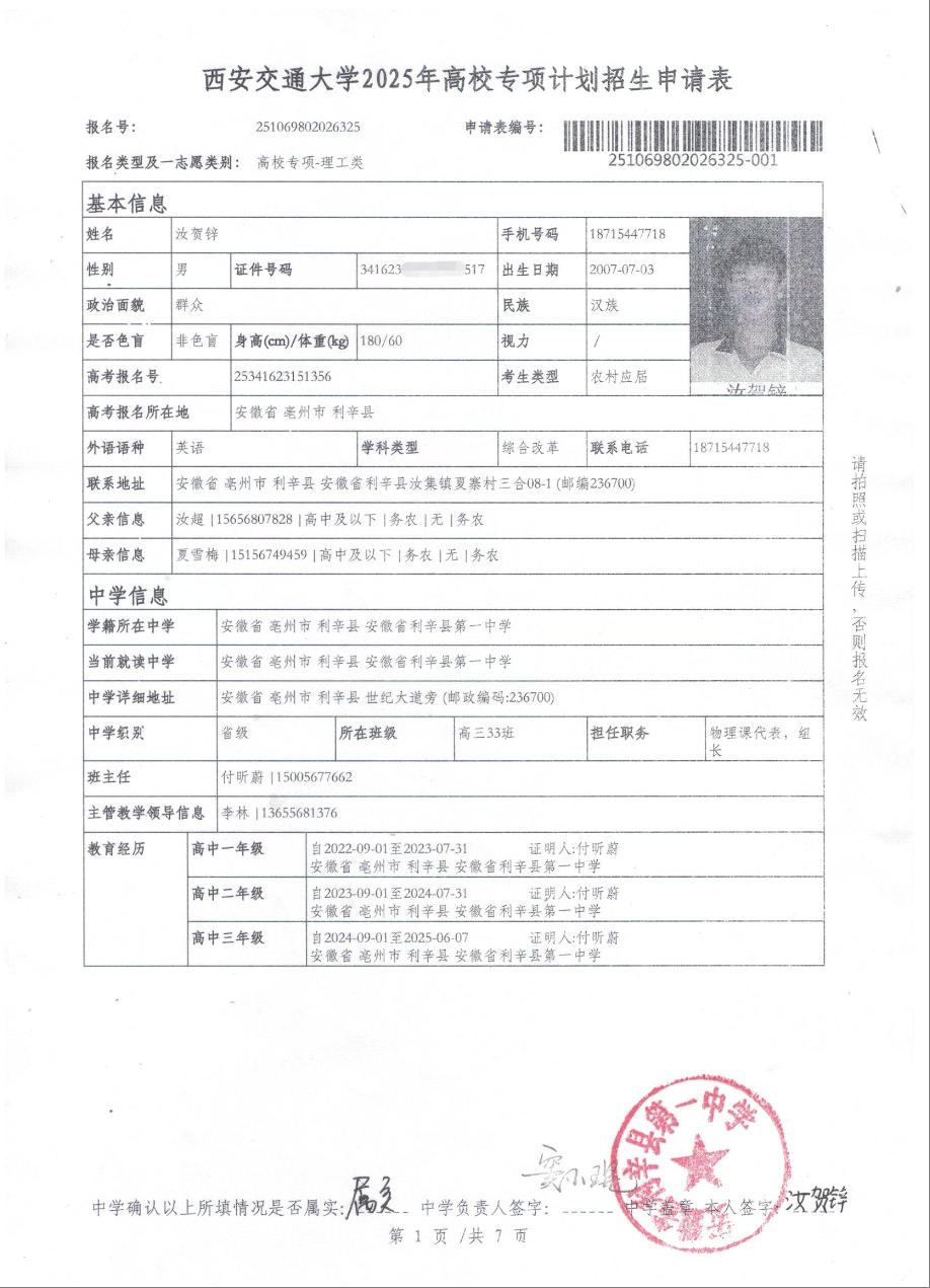 利辛一中2025届报考高校专项计划学生公示——汝贺锌