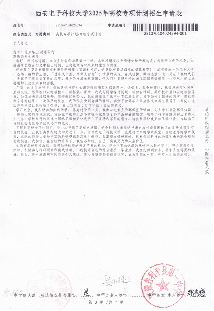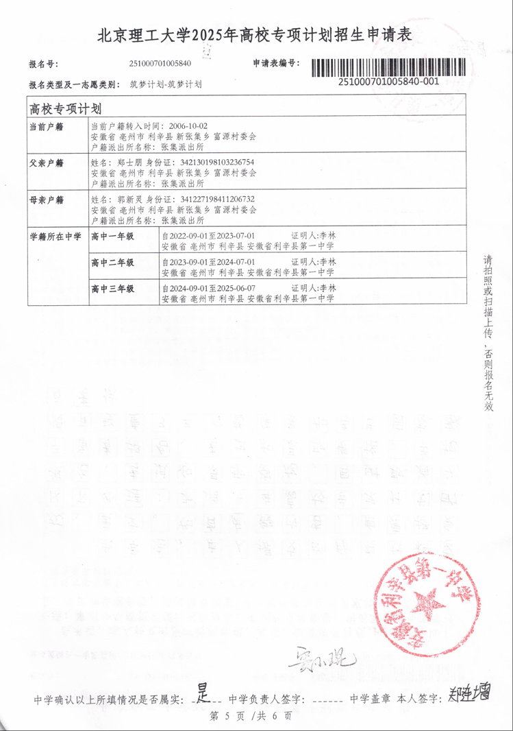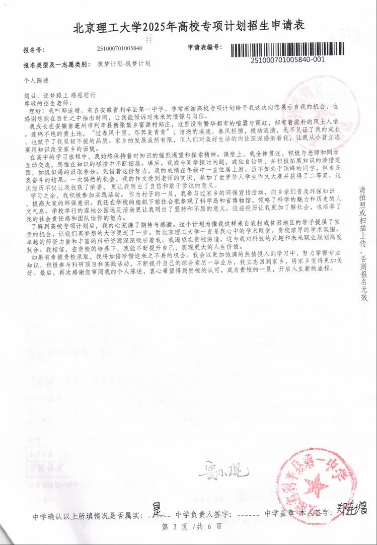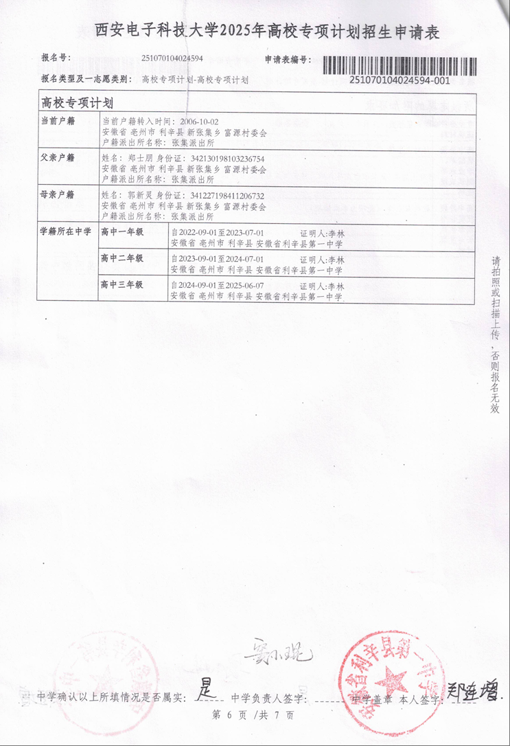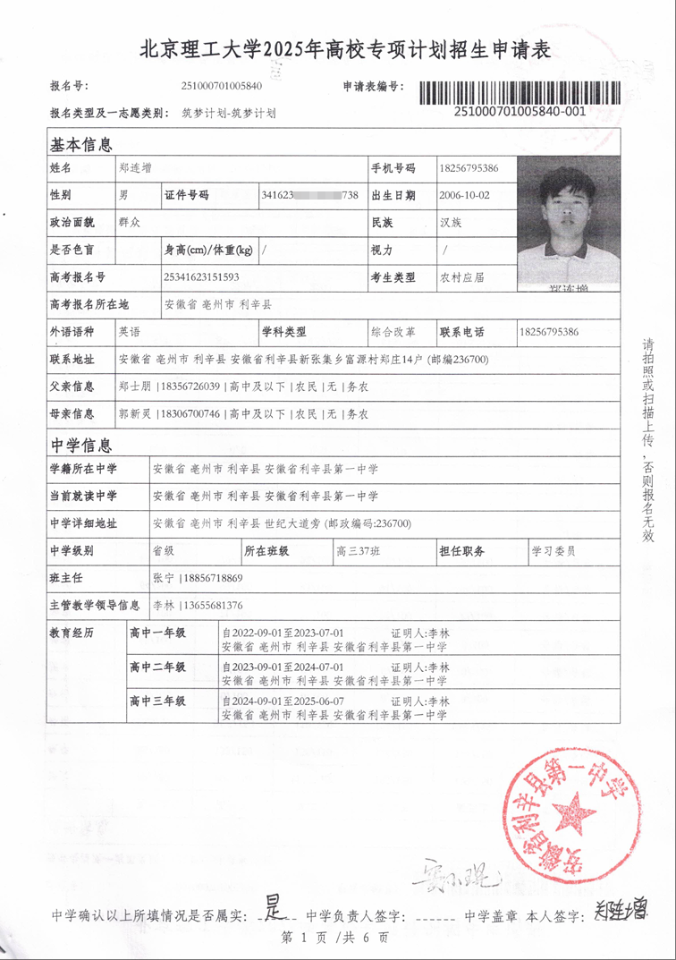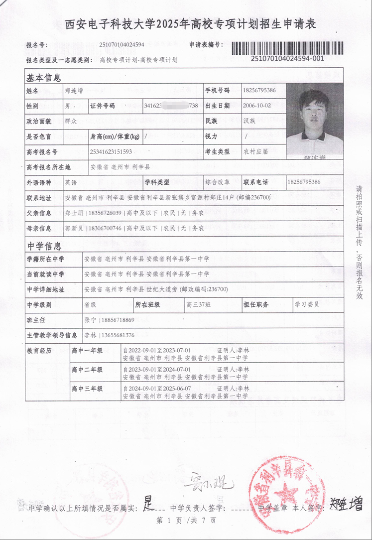 利辛一中2025届报考高校专项计划学生公示——郑连增