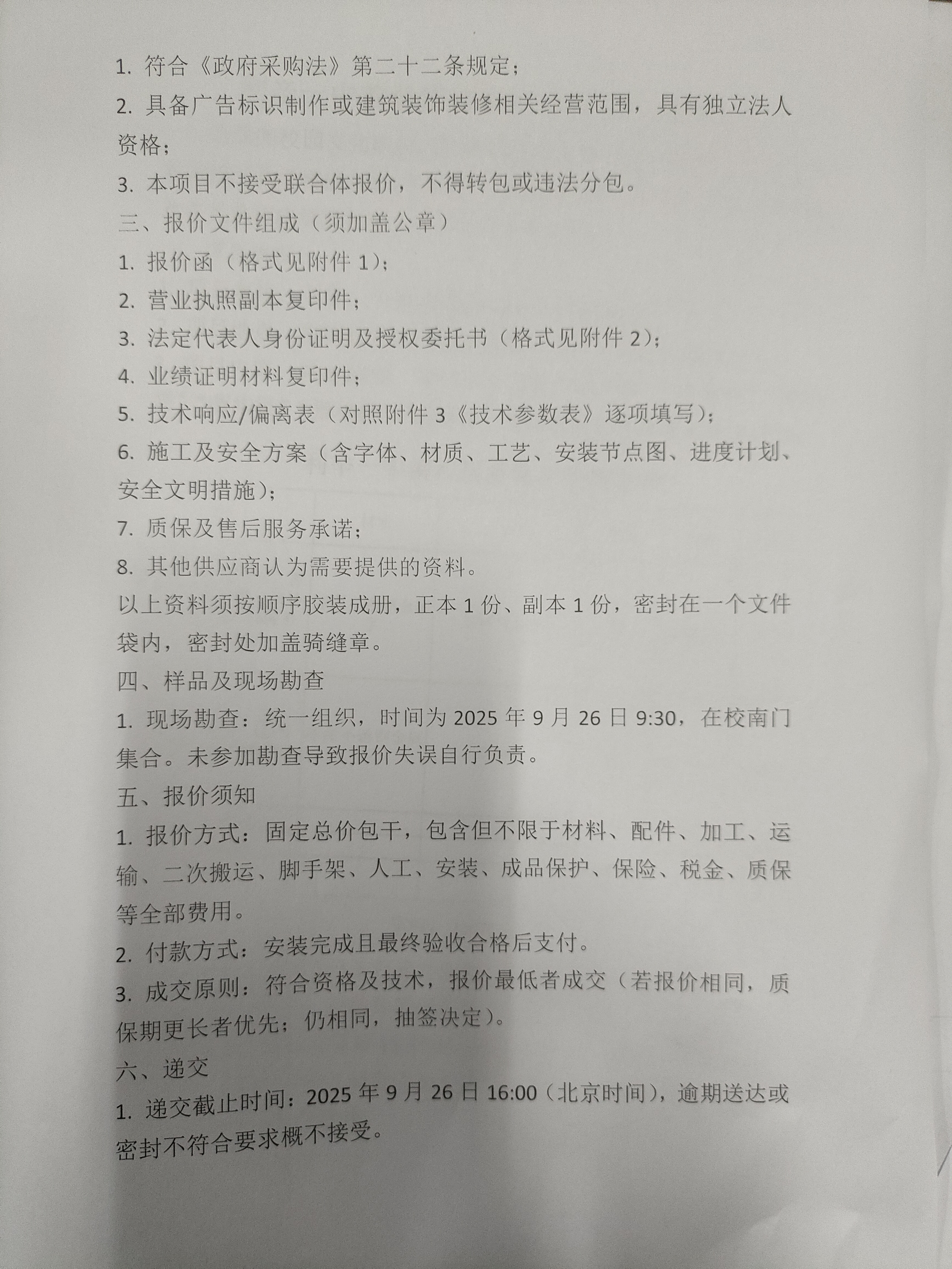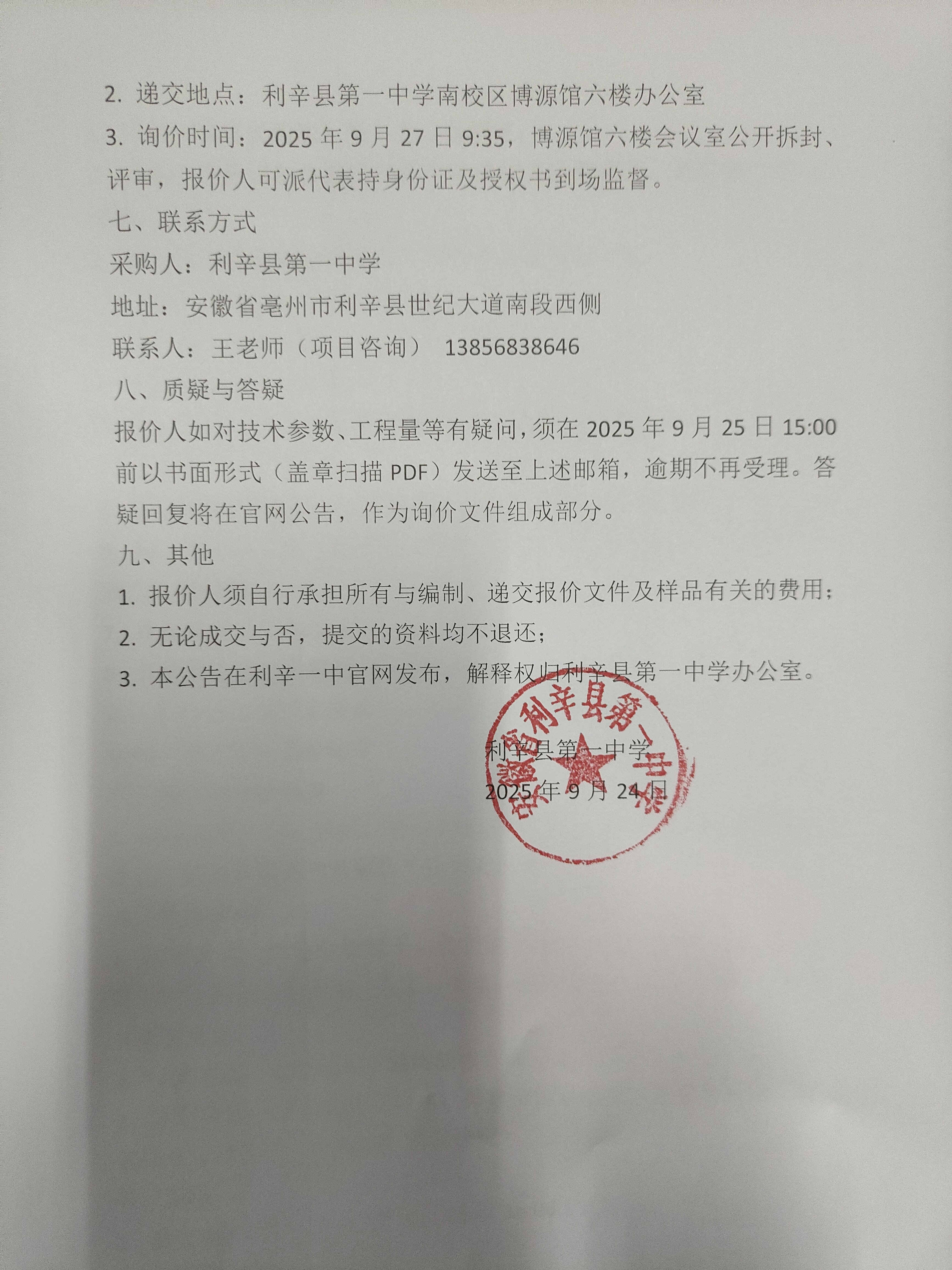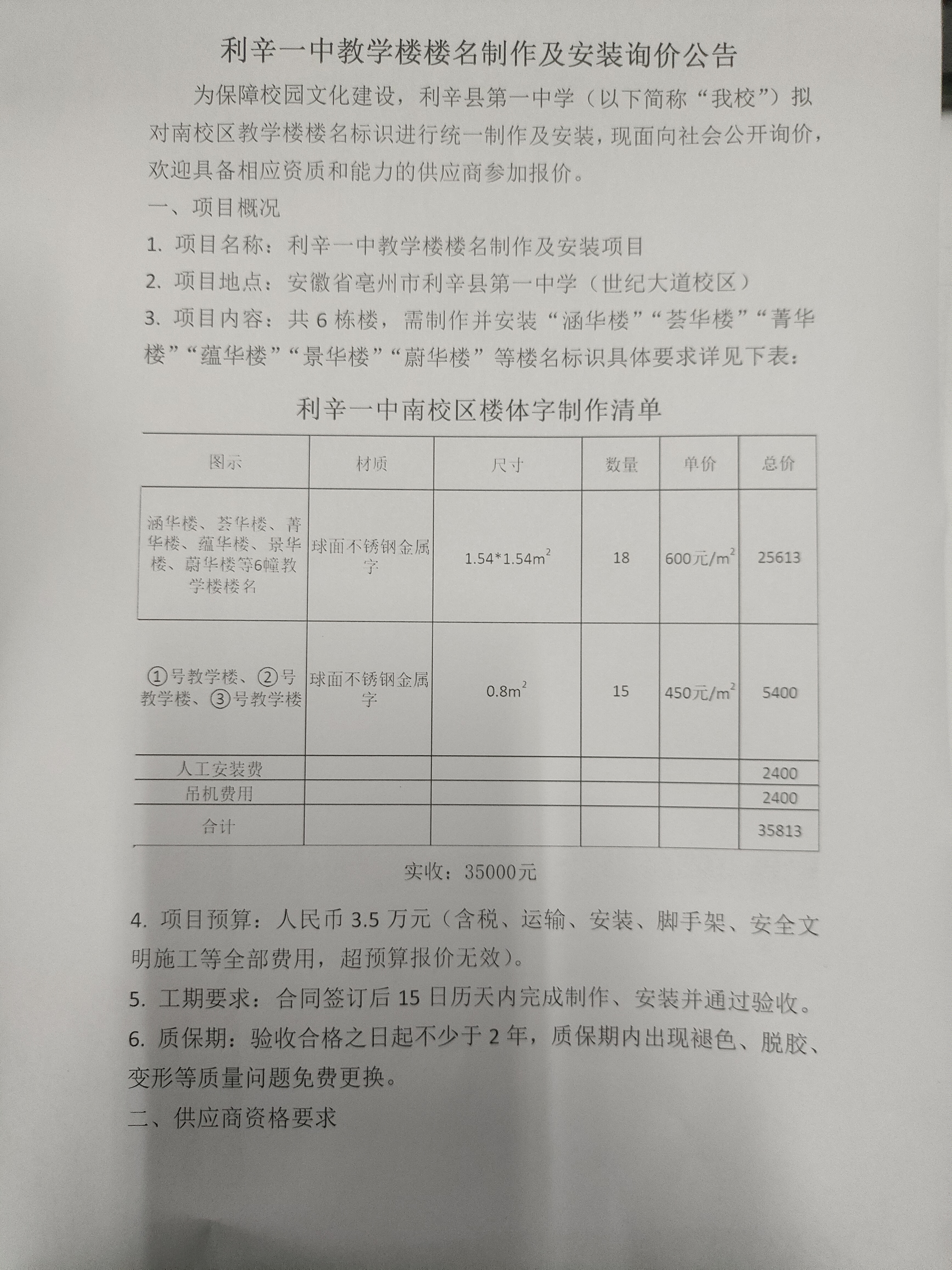 利辛一中教学楼楼名制作及安装询价公告