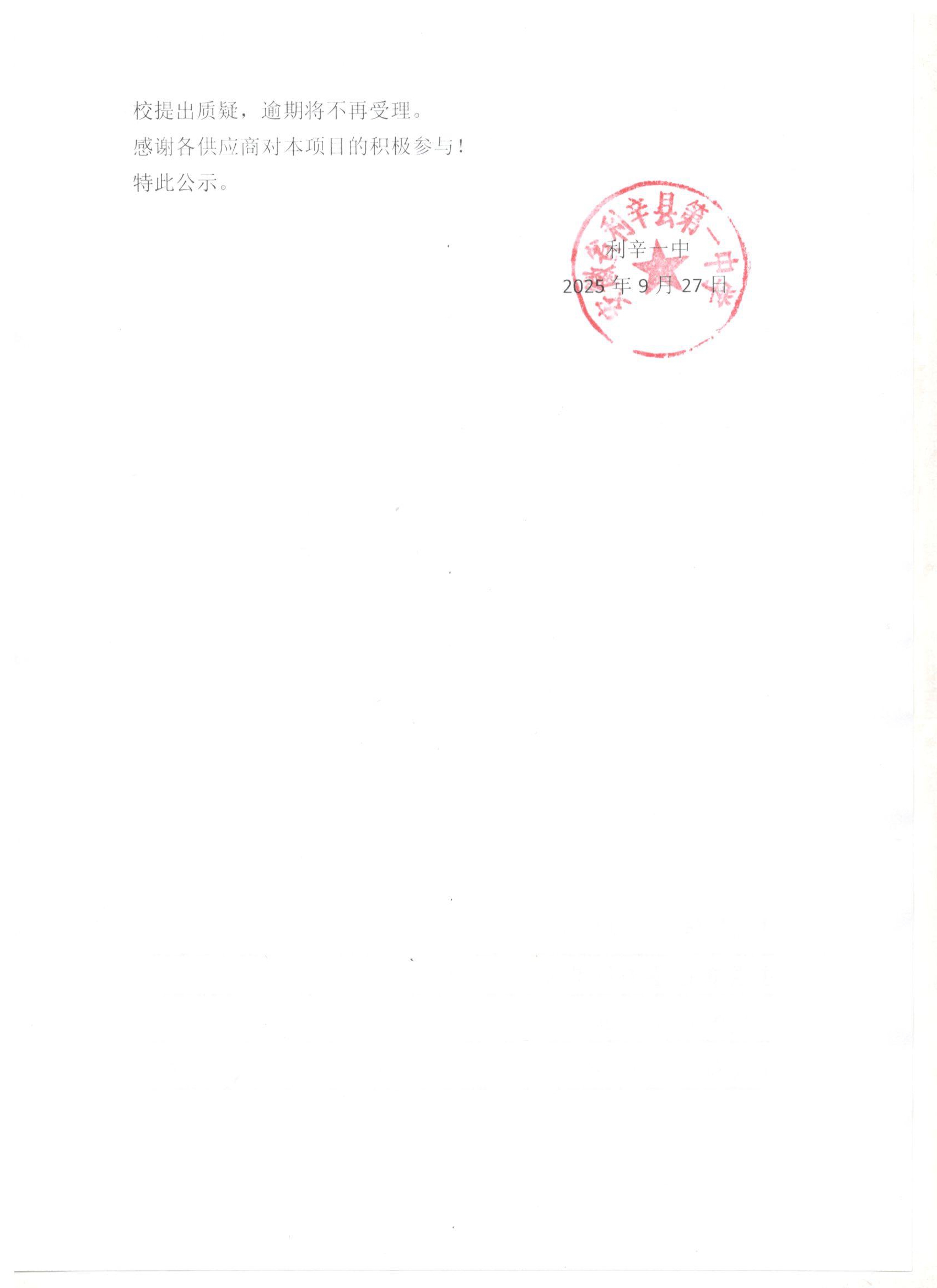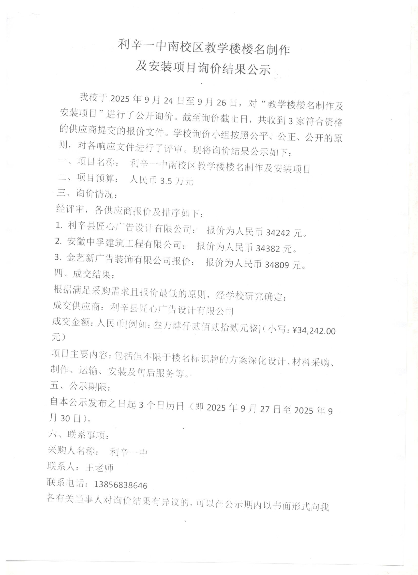 利辛一中南校区教学楼楼名制作及安装项目询价结果公示
