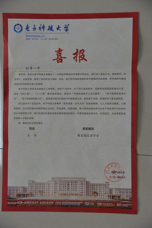 班(班主任赵旗)校友、电子科技大学在校生王任同学荣获国家励志奖学金!
