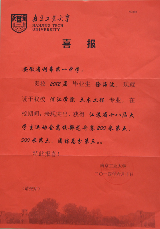 年励志奖学金。我校校友徐海波荣获江苏省十八届大学生运动会高校部龙舟大赛