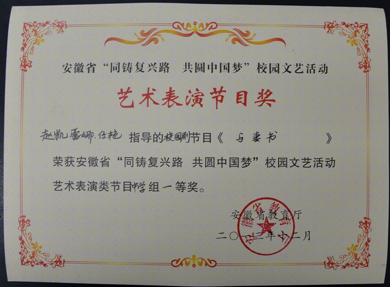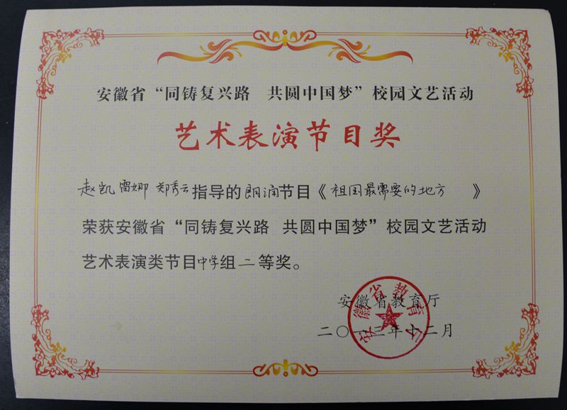 赵凯、雷娜、郑秀云指导的朗诵节目《祖国最需要的地方》荣获安徽省“同铸复兴路 共圆中国梦”校园文艺活动艺术类表演节目中学组二等奖。