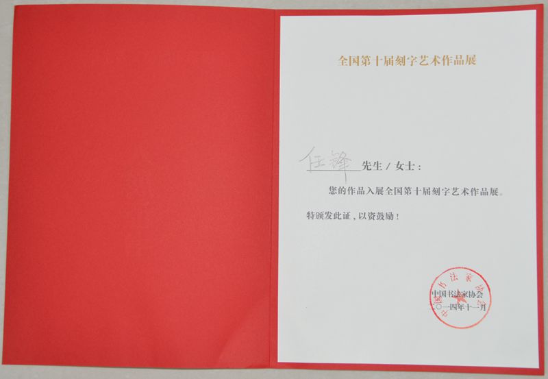 我校任锋同志作品入展第十届全国刻字艺术作品展