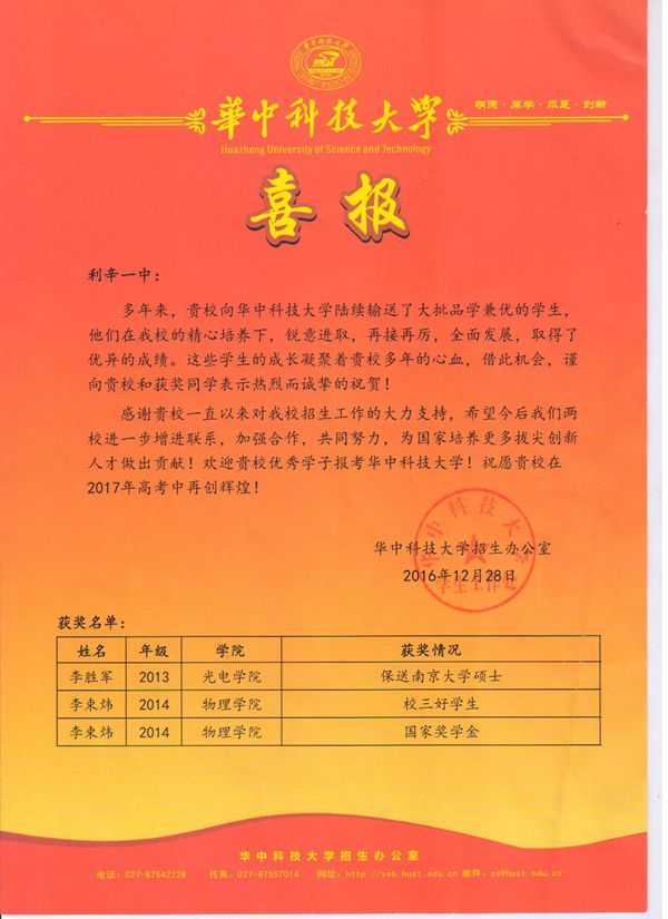 来自华中科技大学的喜报