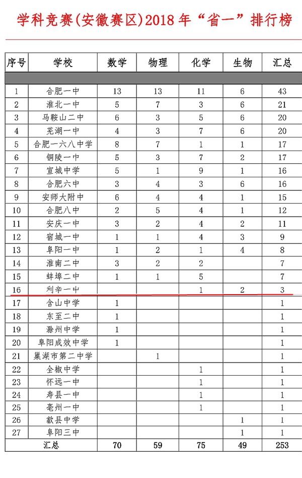 利辛一中2018年奥赛成绩取得重大突破,位居全省第16名,位列全省县城学校第1名。