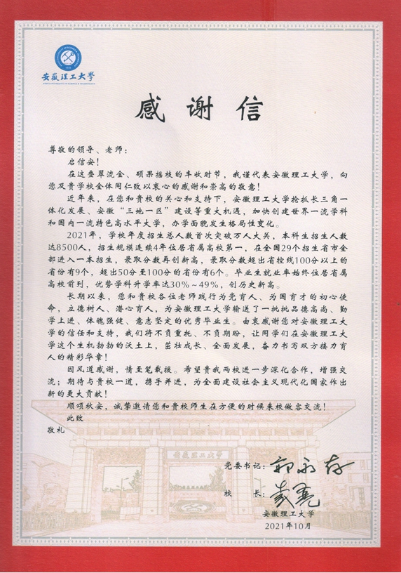 安徽理工大学致我校感谢信