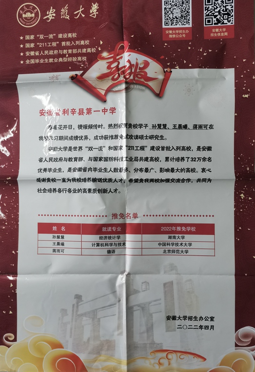 安徽大学致利辛一中喜报