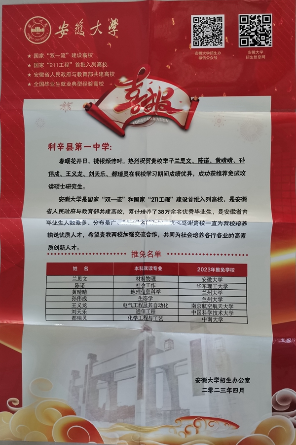 安徽大学传喜报,一中学子持续发展能力强