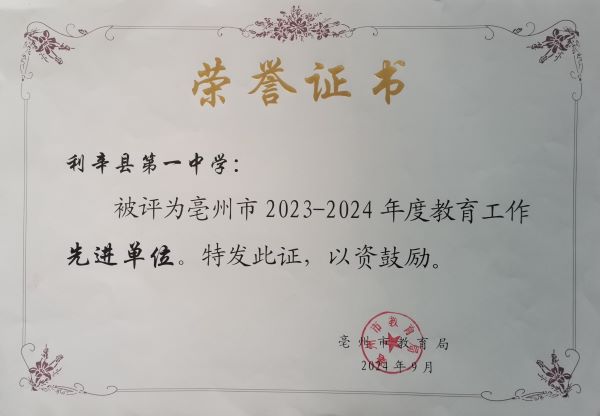 利辛县第一中学被评为亳州市2023—2024年度教育工作先进单位