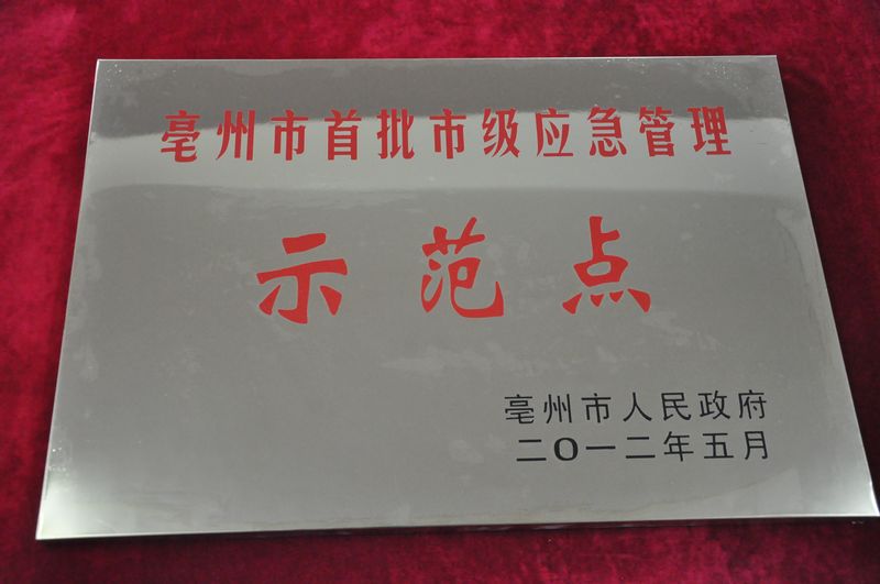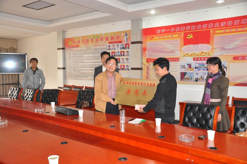 11月1日下午,市政府应急办公室副科长王涛、市公安局指挥中心孙晓伟、市安监局郑见在县政府办公室副主任陆地、县应急办副主任肖玲玲等陪同下,代表市政府向我校授予“亳州市首批市级应急管理示范点”匾牌。