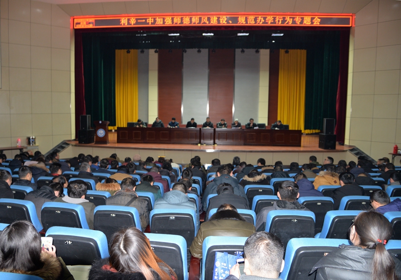 2018年1月29日,利辛一中在图南会堂举行加强师德师风建设、规范办学行为专题会,校党委书记、副校长刘年发表讲话,优秀教师谈成长感悟,全体教职工参加会议。