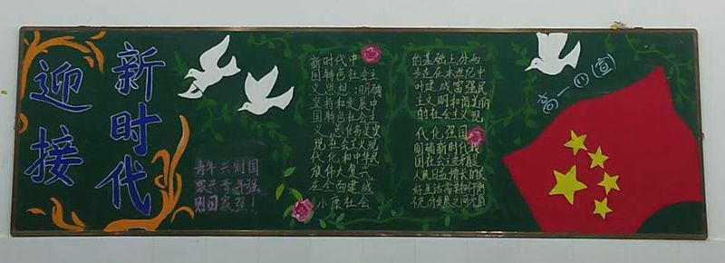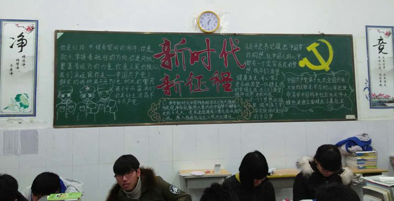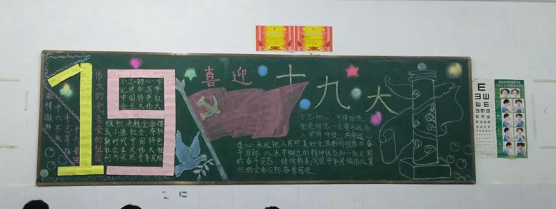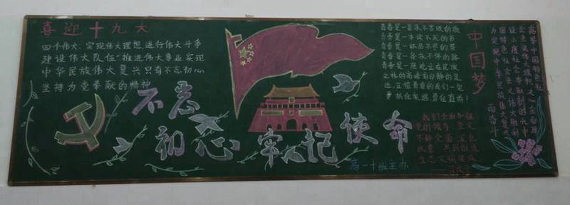 为学习宣传贯彻十九大精神,引导学校团员青年自觉学习十九大、宣传十九大,做十九大精神的坚定贯彻者和宣传员,使团员青年成为宣传践行十九大精神的先锋队,校团委开展“青春献礼十九大,不忘初心跟党走”系列主题活动。 以“青春献礼十九大,不忘初心跟党走”为主题,出版一期黑板报。 12月1日下午课外活动时间,校团委老师和学生会成员对各班出版的黑板报进行了综合打分评比,部分优秀黑板报图片展如下: