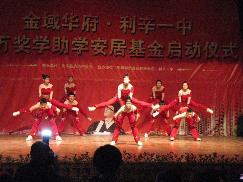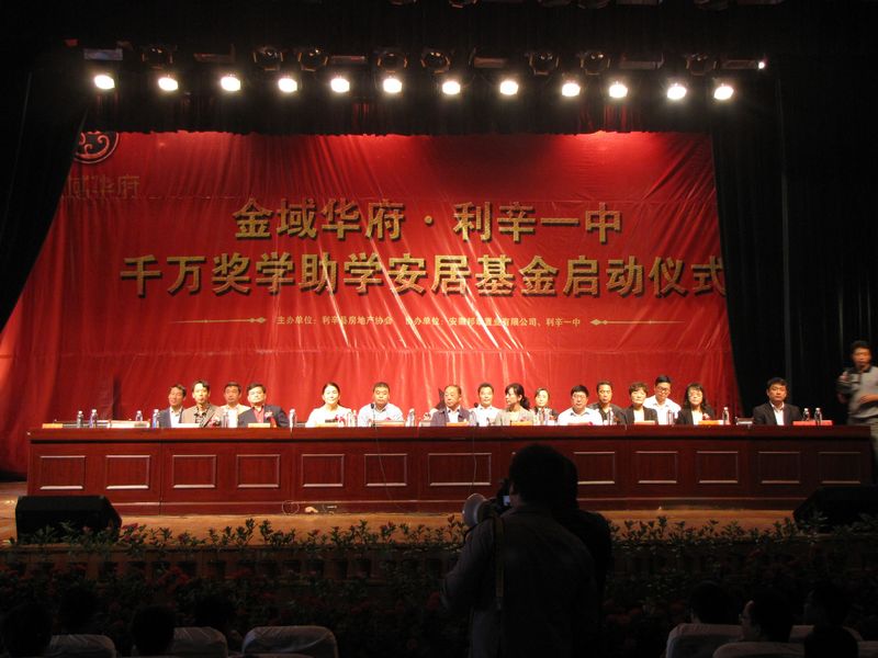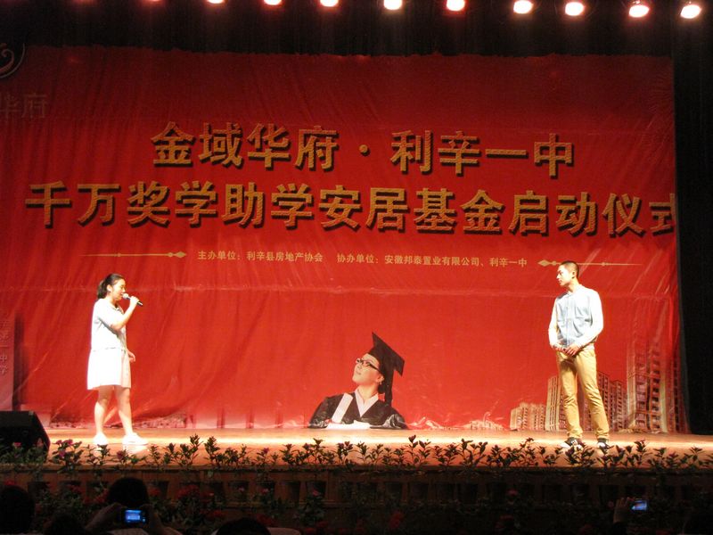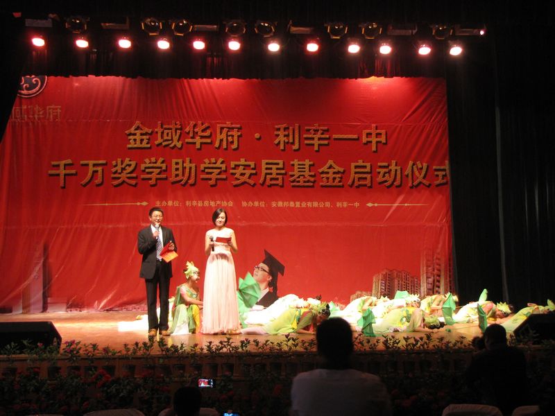 2013年9月28日上午,金域华府·利辛一中千万奖学助学安居基金启动仪式暨文艺汇演在利辛剧院隆重举行,安徽省对外友好交流协会常务副会长、安徽省人民对外友好协会副会长沙林森先生,亳州市外事办公室程亚妹主任,亳州市水务局赵德建局长,利辛县委常委、副县长芮绍勇,副县长金国珍,县政协副主席李红星,县房协徐会长、县住建委、房管局、财政局、教育局等机关领导,利辛一中潘化鹏书记,安徽邦泰置业有限公司董事长、爱国华侨陈齐博士等出席启动仪式。
