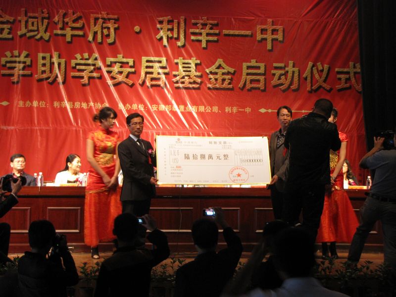 启动仪式上,沙林森副会长、芮绍勇副县长、潘化鹏书记、陈齐董事长和学生代表发表了热情洋溢的讲话,邦泰公司与利辛一中签署了《战略合作协议》,陈齐董事长把68万元奖学助学基金交给利辛一中代表潘化鹏书记,沙林森副会长和芮绍勇副县长为“金域华府·利辛一中千万奖学助学安居基金”揭牌。