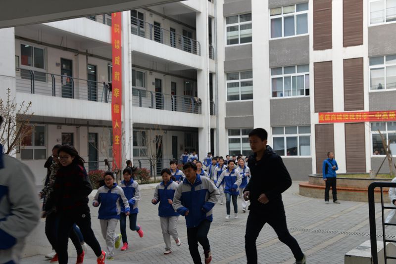 听到警报,同学们在老师、班长的组织下快速有序逃生