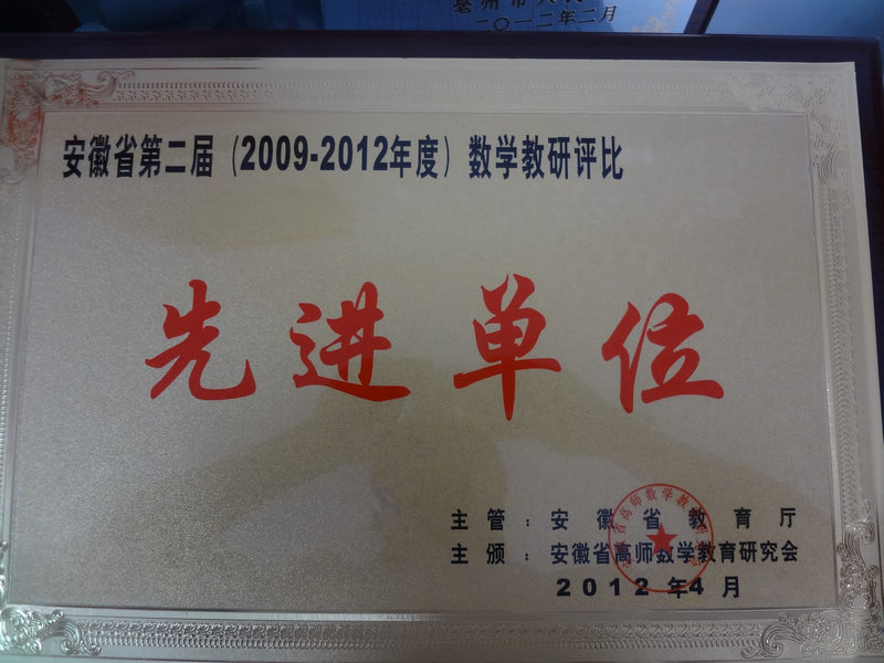 四月上旬,省数研会年会在安庆召开。在这次年会上,我校获得“安徽省第二届(2009—2012年度)数学教研评比先进单位。在这四年里,我校所选送的论文有12篇获省一等奖,16篇获省二等奖。其中,朱润、丁浩、武高峰、吴磊、孙兵兵、刘茹、吴琳、时晓瑜等老师所撰写的文章受到了数研会专家的好评!时晓瑜老师提交的文章:《例析数学方法在物理中的应用》是跨学科教研的典范,引起了大家的关注;徐燕飞、朱润、武高峰三位老师在说课比赛中,获省二等奖和三等奖。数研会的领导和专家对我校重视教研工作,给予了很高的评价!