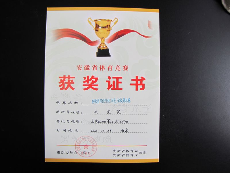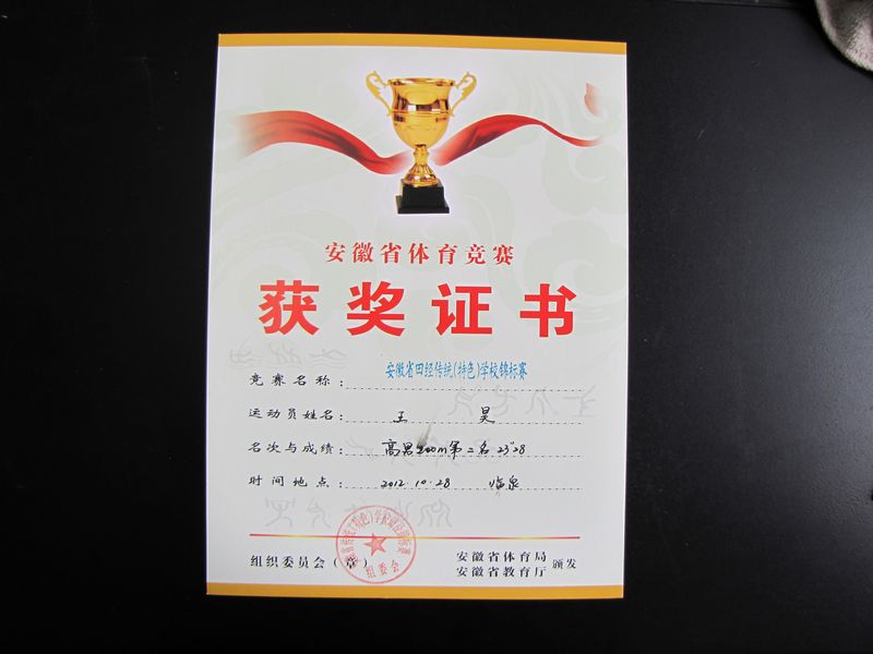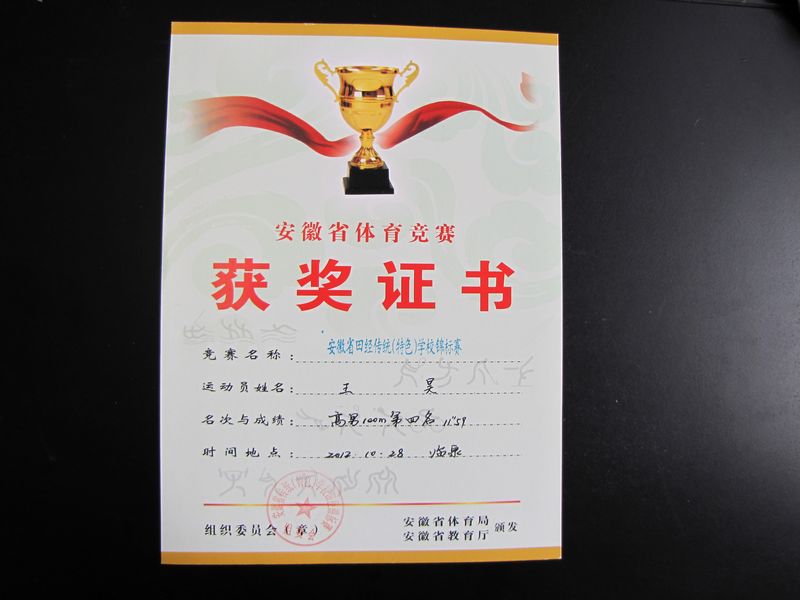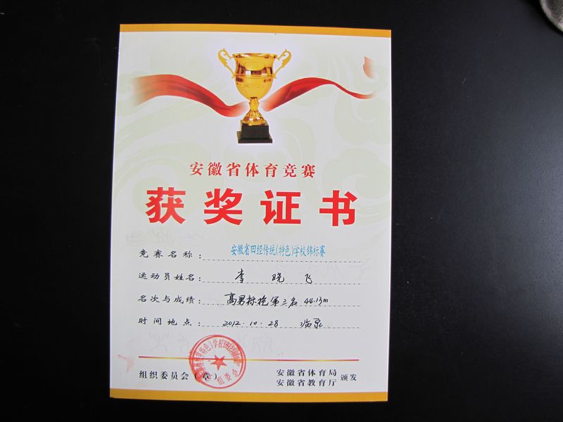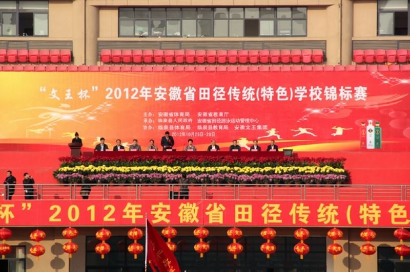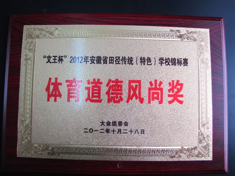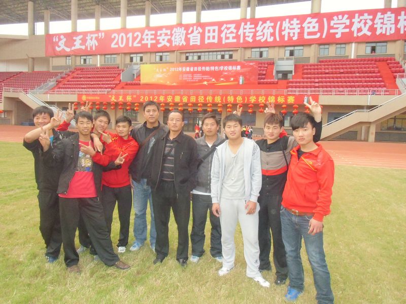 2012年10月25—28日,“文王杯”2012年安徽省田径传统(特色)学校锦标赛在安徽省最大的县级体育场——临泉县体育场隆重举行,来自全省各地市的61支代表队、约900名运动员参加小学组、初中组和高中组70个项目的比赛。我校运动健儿在齐新华、袁立志、崔智三位教师的带领下,团结进取,奋力拼搏,再创佳绩,荣获男子团体第七名。获奖选手名单如下: