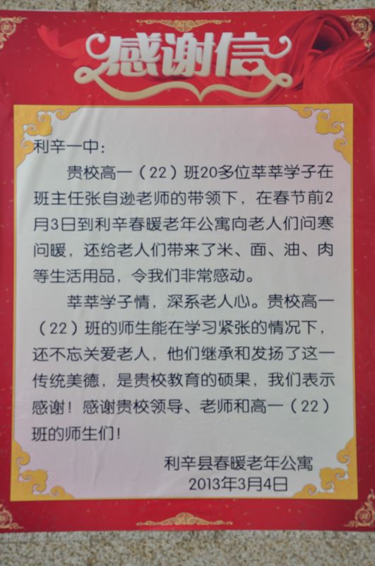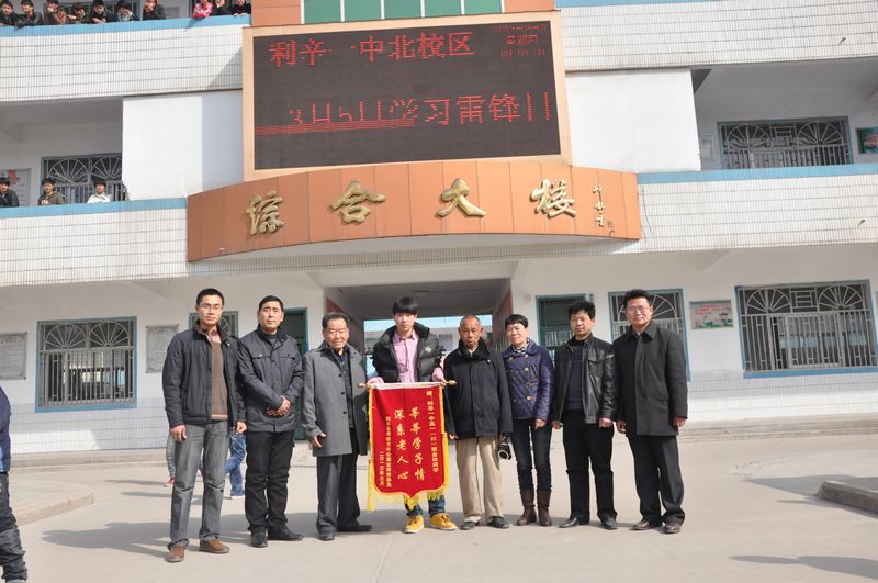3月7日上午,县春暖老年公寓的负责人及老年入住老人代表,捧着写有“莘莘学子情,深系老人心”的锦旗,送到了利辛一中北校区。