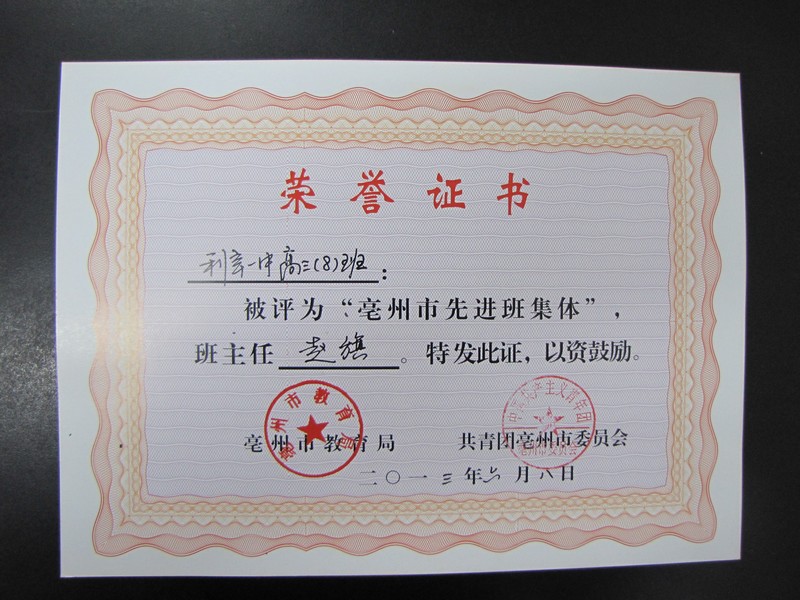 祝贺我校2013届高三8班、16班、17班荣获亳州市先进班集体称号