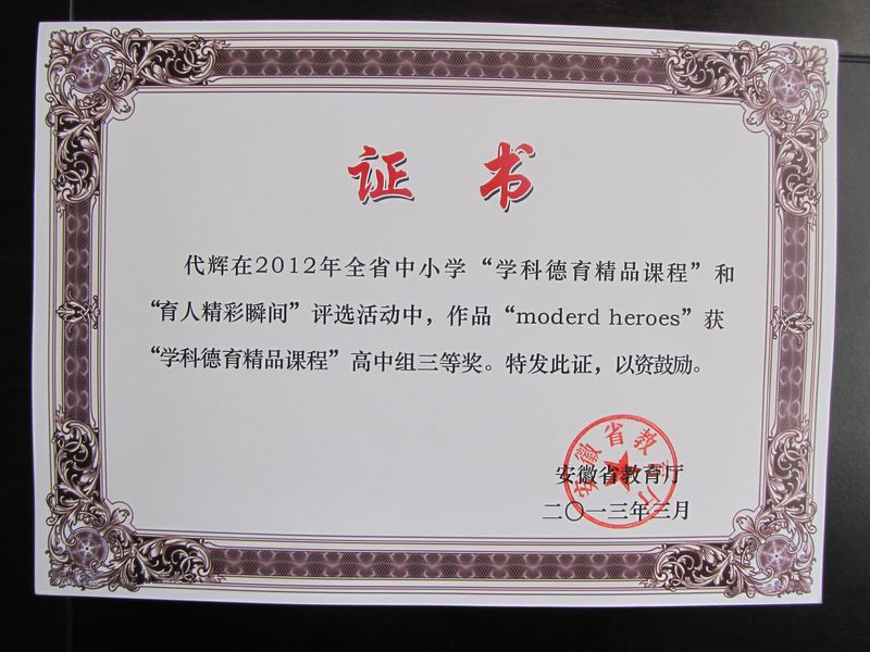 代辉老师在2012年全省中小学“学科德育精品课程”和“育人精彩瞬间”评选活动中,作品“moderd heroes”获“学科德育精品课程”高中组三等奖。