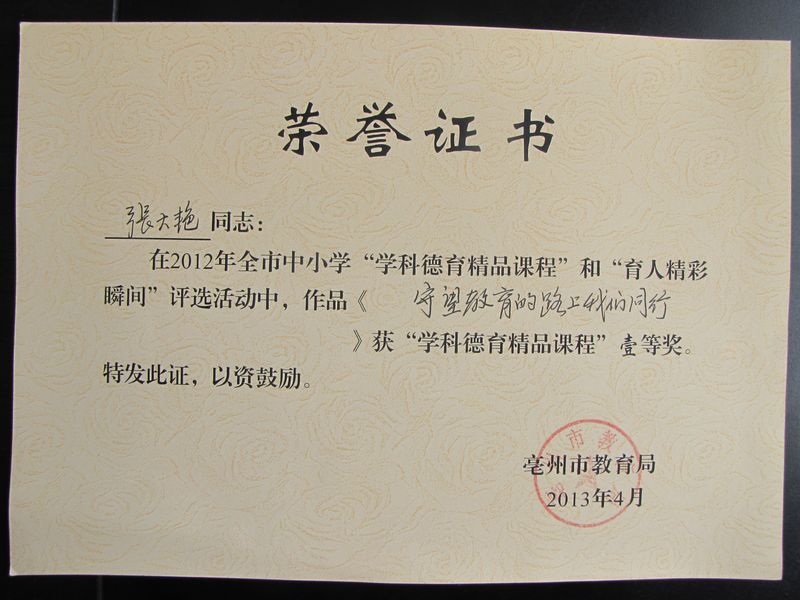张大艳老师在2012年全市中小学“学科德育精品课程”和“育人精彩瞬间”评选活动中,作品《守望教育的路上我们同行》获“学科德育精品课程”一等奖。