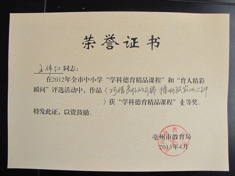 王伟红老师在2012年全市中小学“学科德育精品课程”和“育人精彩瞬间”评选活动中,作品《巧借良好的开端 撞响孤寂的心钟》获“学科德育精品课程”一等奖。