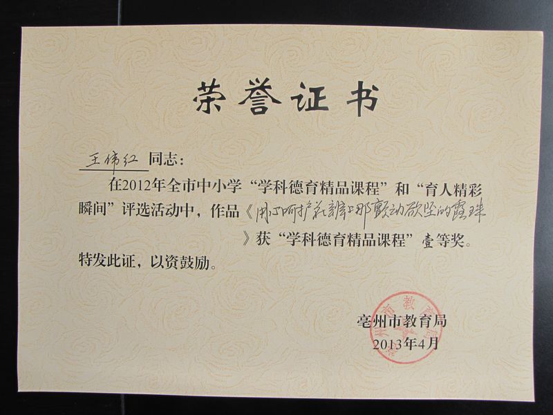 王伟红老师在2012年全市中小学“学科德育精品课程”和“育人精彩瞬间”评选活动中,作品《用心呵护花瓣上那颤动欲坠的露珠》获“学科德育精品课程”一等奖。