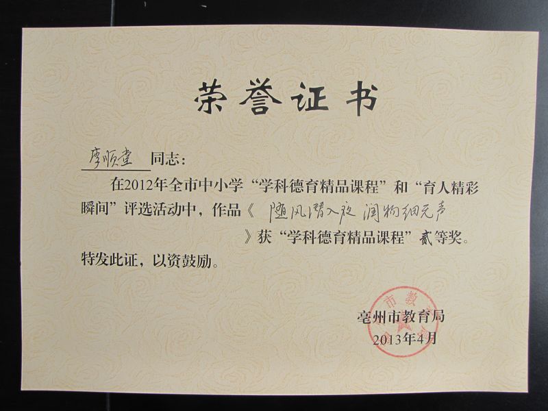 李顺堂老师在2012年全市中小学“学科德育精品课程”和“育人精彩瞬间”评选活动中,作品《随风潜入夜 润物细无声》获“学科德育精品课程”二等奖。