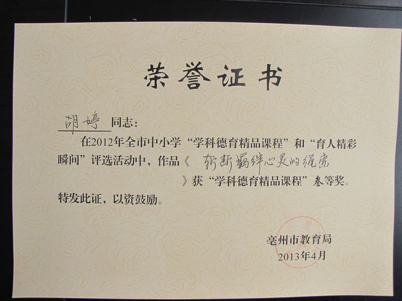 胡婷老师在2012年全市中小学“学科德育精品课程”和“育人精彩瞬间”评选活动中,作品《斩断羁绊心灵的绳索》获“学科德育精品课程”三等奖。
