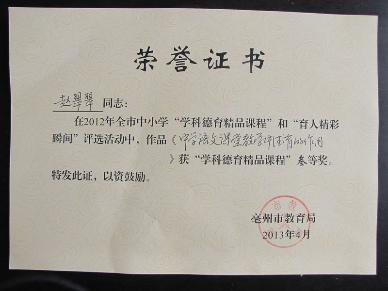 赵翠琴老师在2012年全市中小学“学科德育精品课程”和“育人精彩瞬间”评选活动中,作品《中学语文课堂教学中德育的作用》获“学科德育精品课程”三等奖。