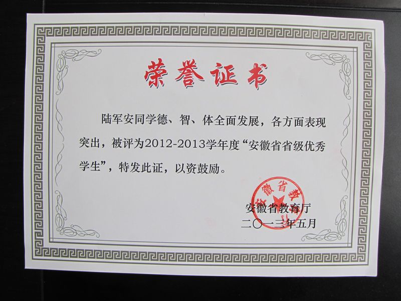 陆军安同学被安徽省教育厅授予“安徽省省级优秀学生”光荣称号